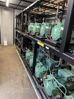 The Space multi Bitzer compressor refrigeration pack is running on R744 (CO₂) with an External ECO₂ Maxi Booster. The gas cooler was manufactured by Coolers & Condensers. A new RDM alarm monitoring system / data manger, fixture and plant controllers were supplied and installed, along with a CPC refrigerant leak detection system.