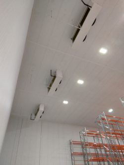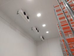 To meet the cooling load and match the design criteria, the chill store required 4off Guntner ceiling mounted evaporators, with an equal split between the refrigeration systems.  Each evaporator was fitted with off cycle defrost.  The control panels were positioned in the roof void.